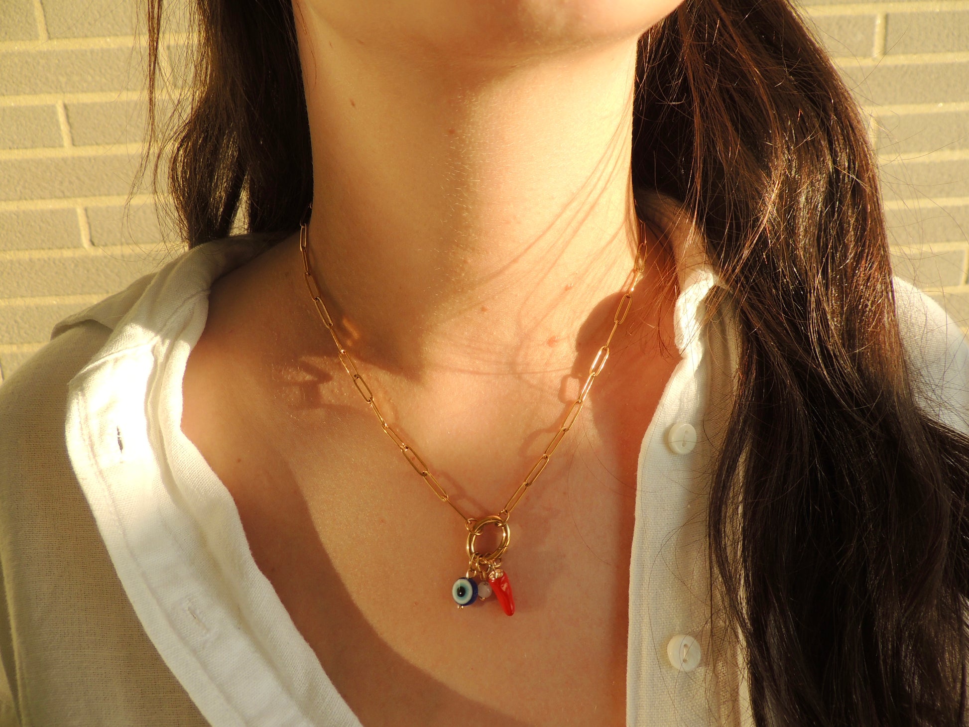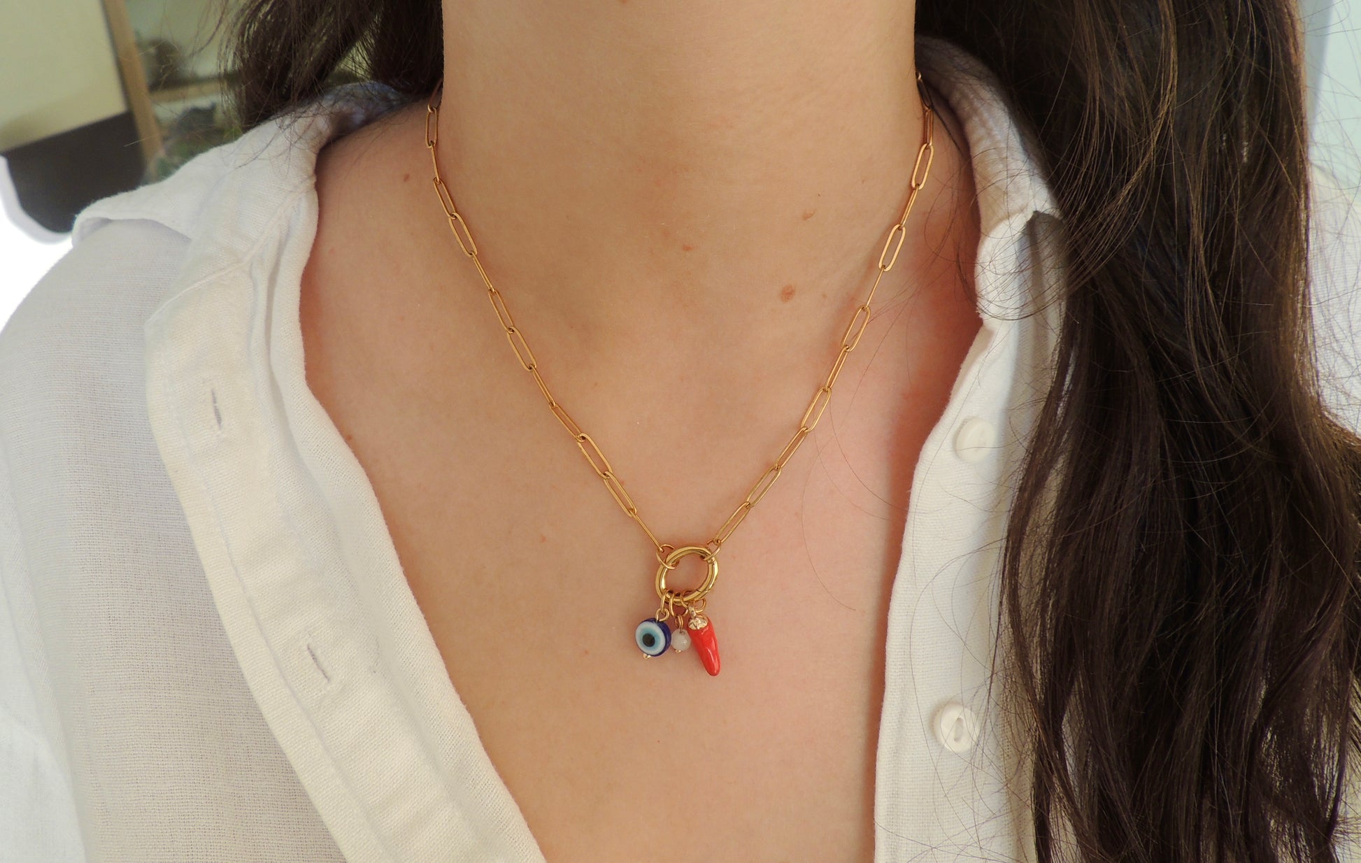 Ce collier délicat se distingue par sa chaîne à maillons fins et ses trois breloques. Un bijou minimaliste mais plein de caractère, parfait pour illuminer toutes vos tenues, du quotidien aux soirées.