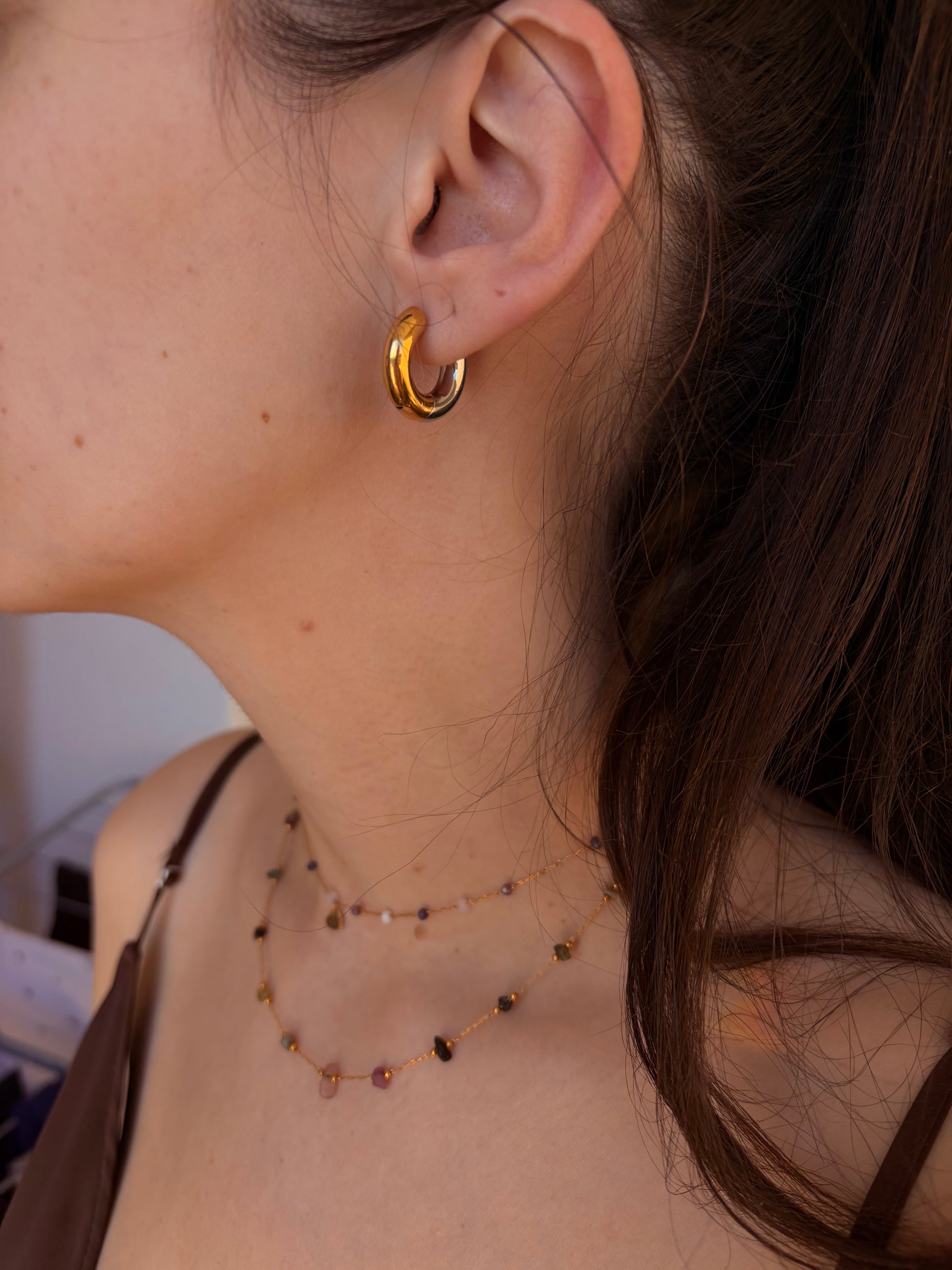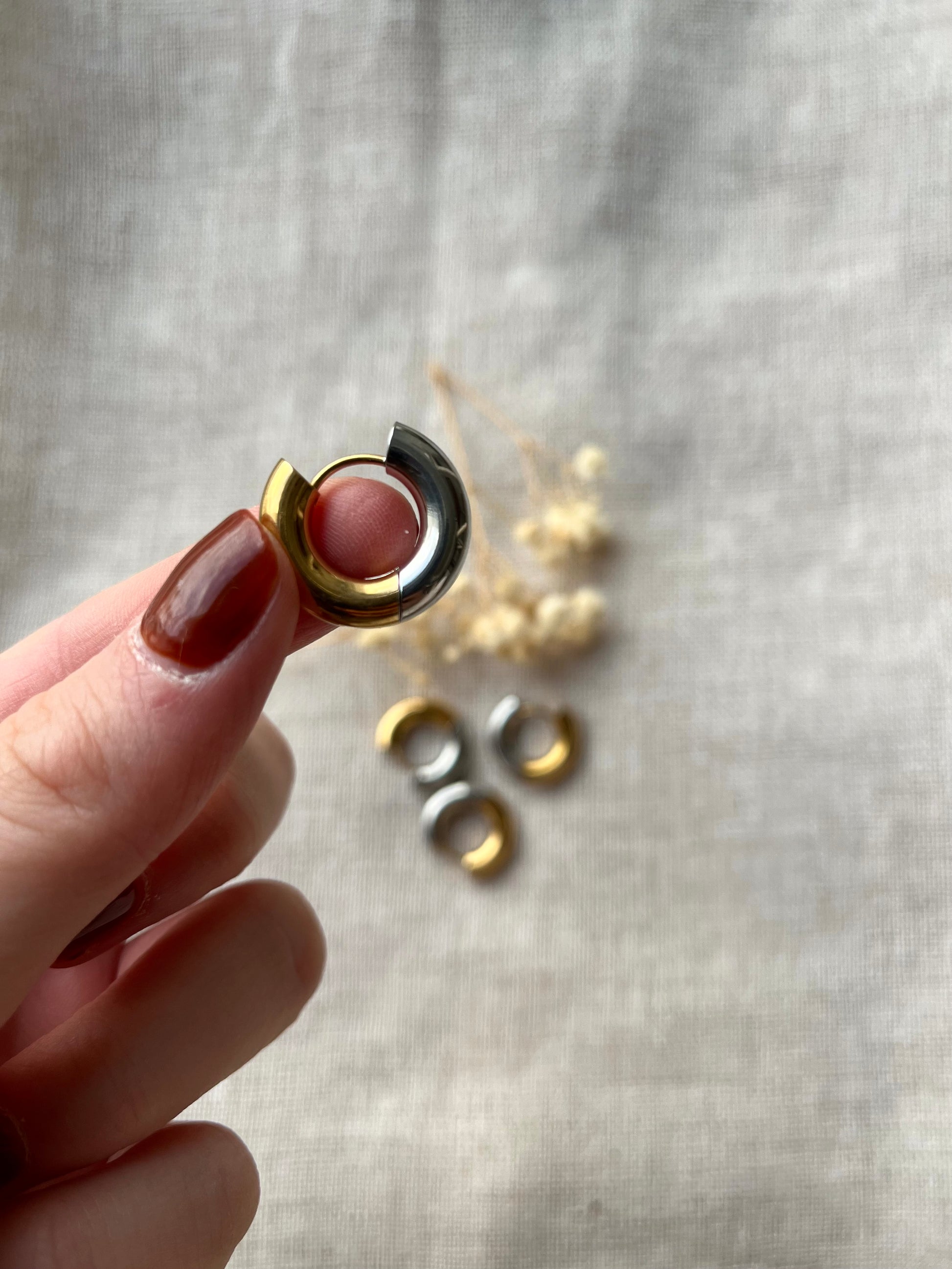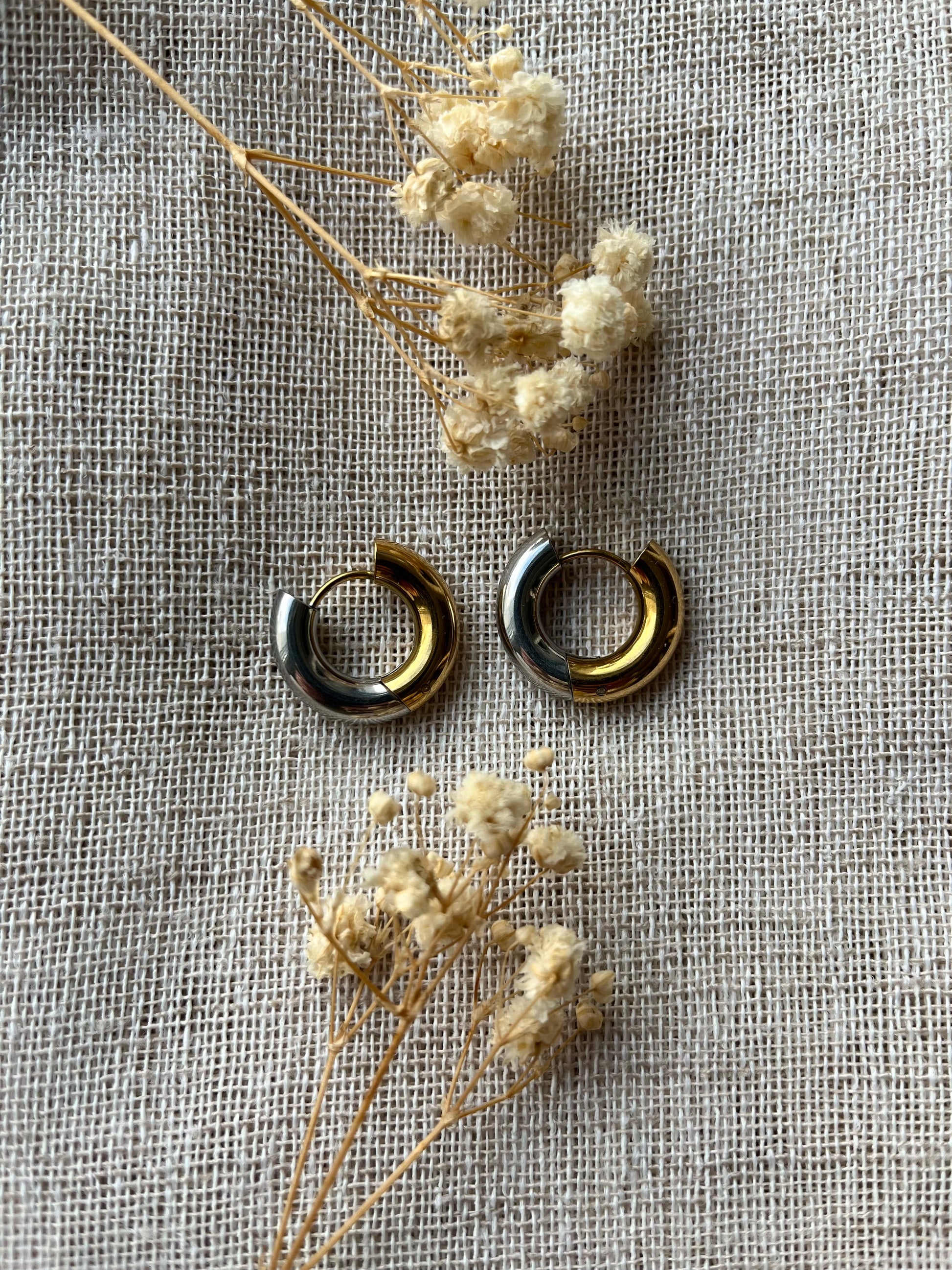 Créoles bicolores au design épuré, mêlant doré et argenté pour une touche chic et intemporelle.
