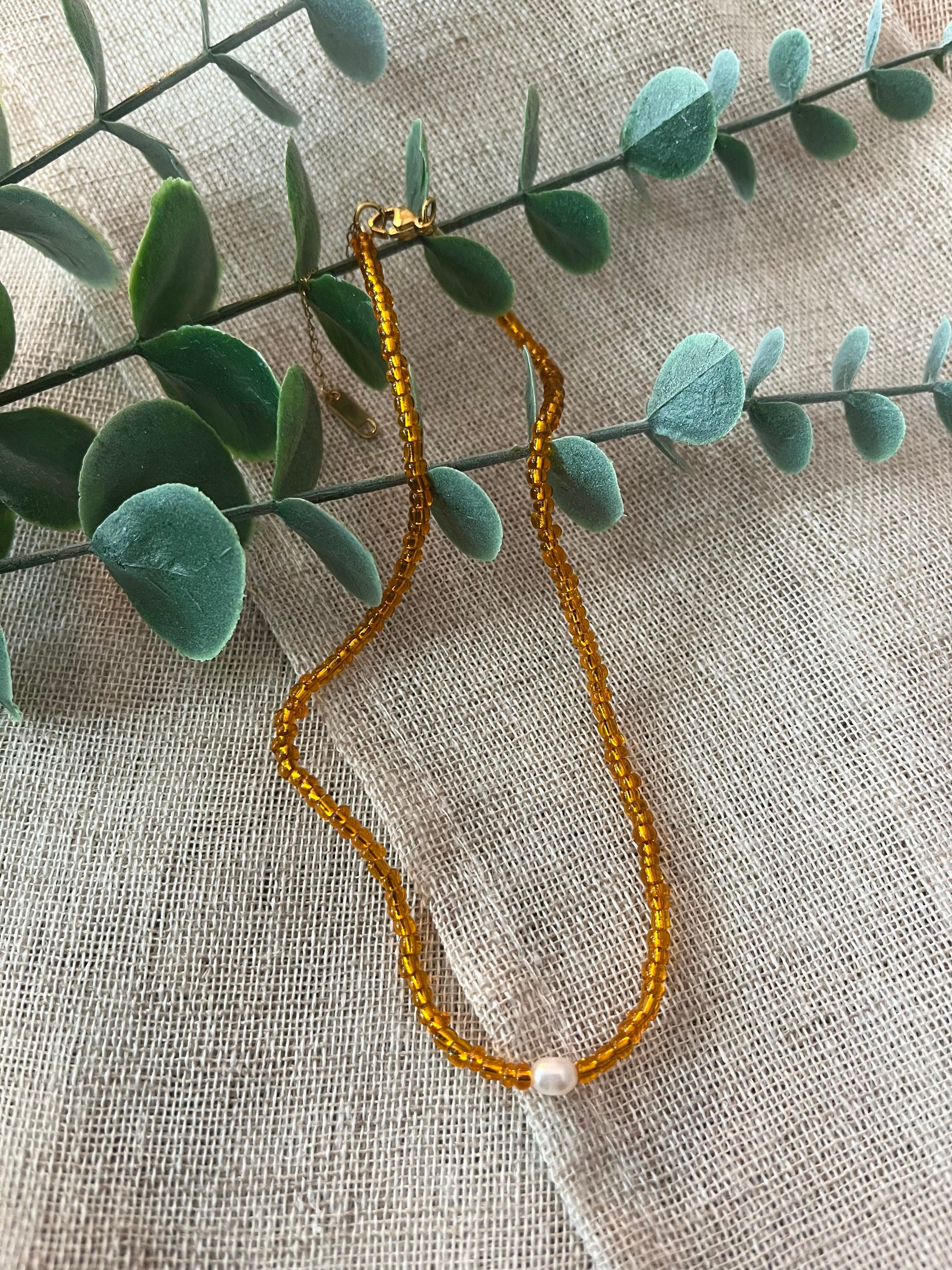 Collier délicat composé de petites perles colorées translucides, sublimé par une perle d’eau douce centrale. Fin et lumineux, il apporte une touche de fraîcheur naturelle et se porte facilement au quotidien.