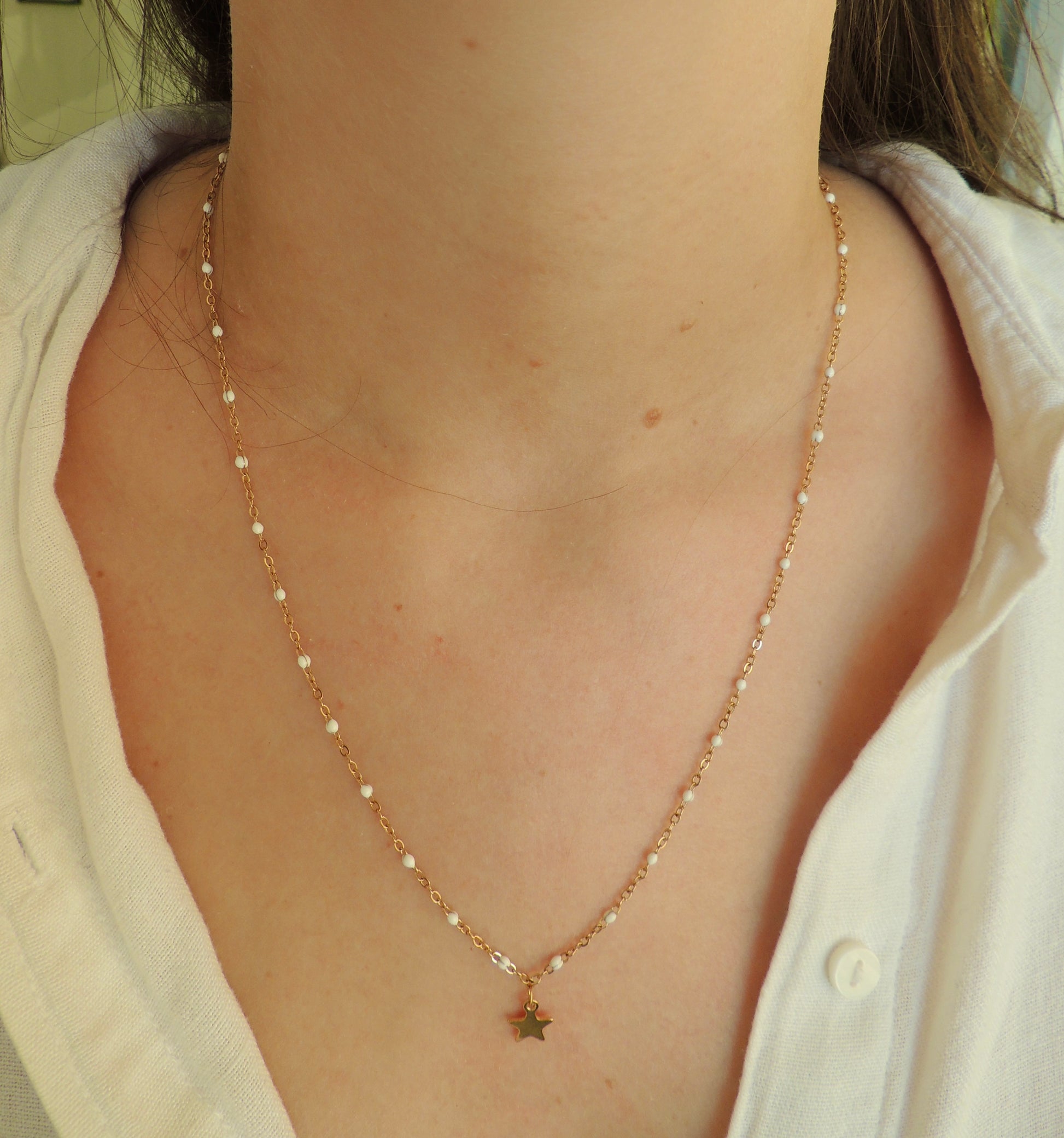 Bien que le bijou soit en acier inoxydable, évitez le contact prolongé avec l’eau, les parfums et les produits chimiques afin de préserver l’éclat du doré et la brillance de la breloque.